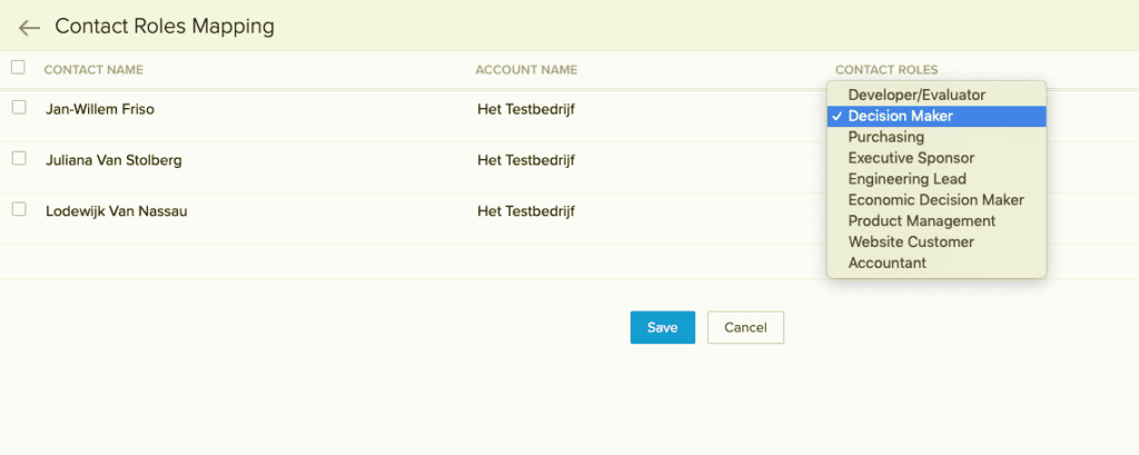 Vervolgens klik je in de linkerkolom bij 'Contact Roles.' Er gaat nu een nieuw scherm open waarin je bij de diverse contactpersonen bij je klant kunt aanduiden welke hun specifieke rol is in de 'potential.' Zijn niet alle contacten betrokken? Dan vink je niet aan in de linkerkolom. Op deze schermafbeelding is het meteen duidelijk.
