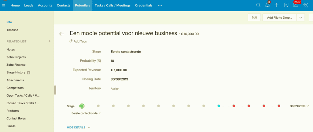 Je maakt voor je klant of potentiële klant een zogenaamde 'opportunity' aan (afhankelijk van de taalinstellingen in je systeem zal eventueel de naam 'deal' of 'potential' gebruikt worden). In ons onderstaande voorbeeld maakten we voor onze klant een potential van 10.000 EUR die zich in de fase van de eerste contactronde bevindt. Het is dus een verse kans om tegen het eind van de maand een mooie verkoop te regelen.